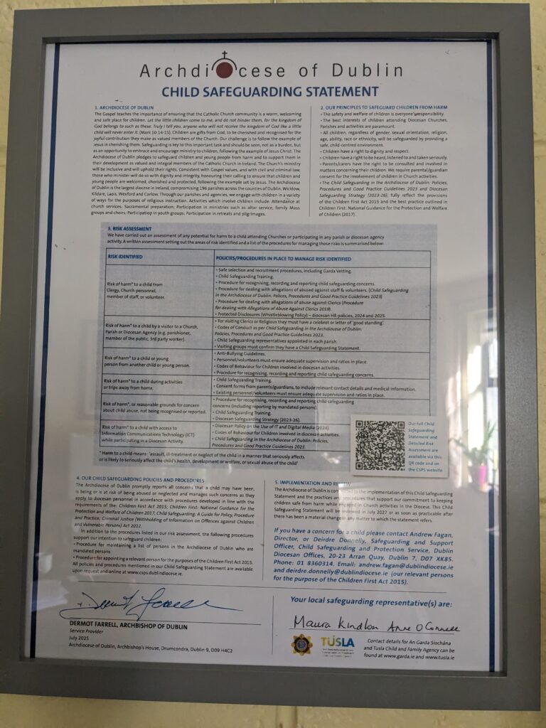 The Archdiocese of Dublin Child Safeguarding & Protection Policy and Procedures requires all employees in the Diocese or Parishes and all involved as Volunteers, Ministers or Parish Groups to be Garda Vetted.